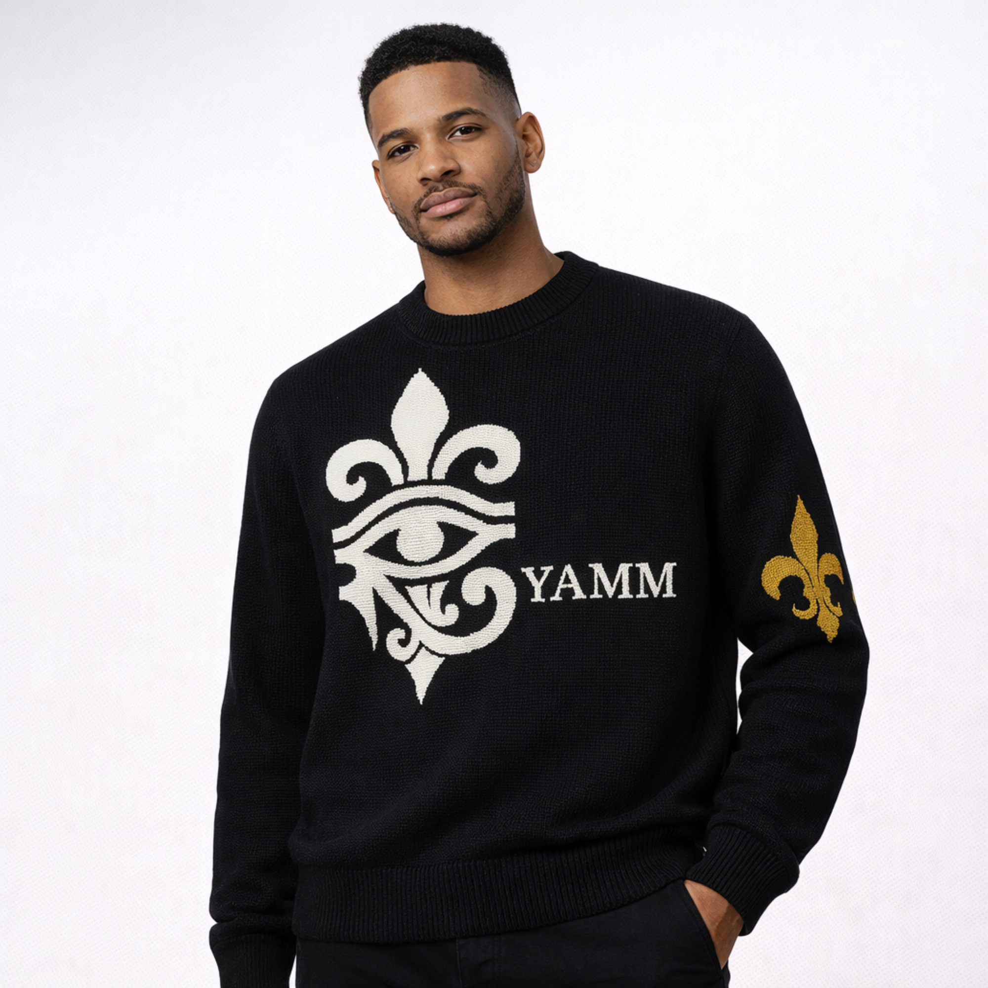 Le Pull Mocha est une création signature de la Maison YAMM Genève, où l’art du motif rencontre la rigueur du savoir-faire. Tricoté dans une maille épaisse couleur ivoire, il arbore sur la poitrine le célèbre Œil YAMM surmonté d’une fleur de lys, symbole de royauté et de mystère. La manche gauche est ornée d’un motif doré, ajoutant une touche subtile de lumière à l’ensemble. Un équilibre parfait entre puissance visuelle et raffinement.