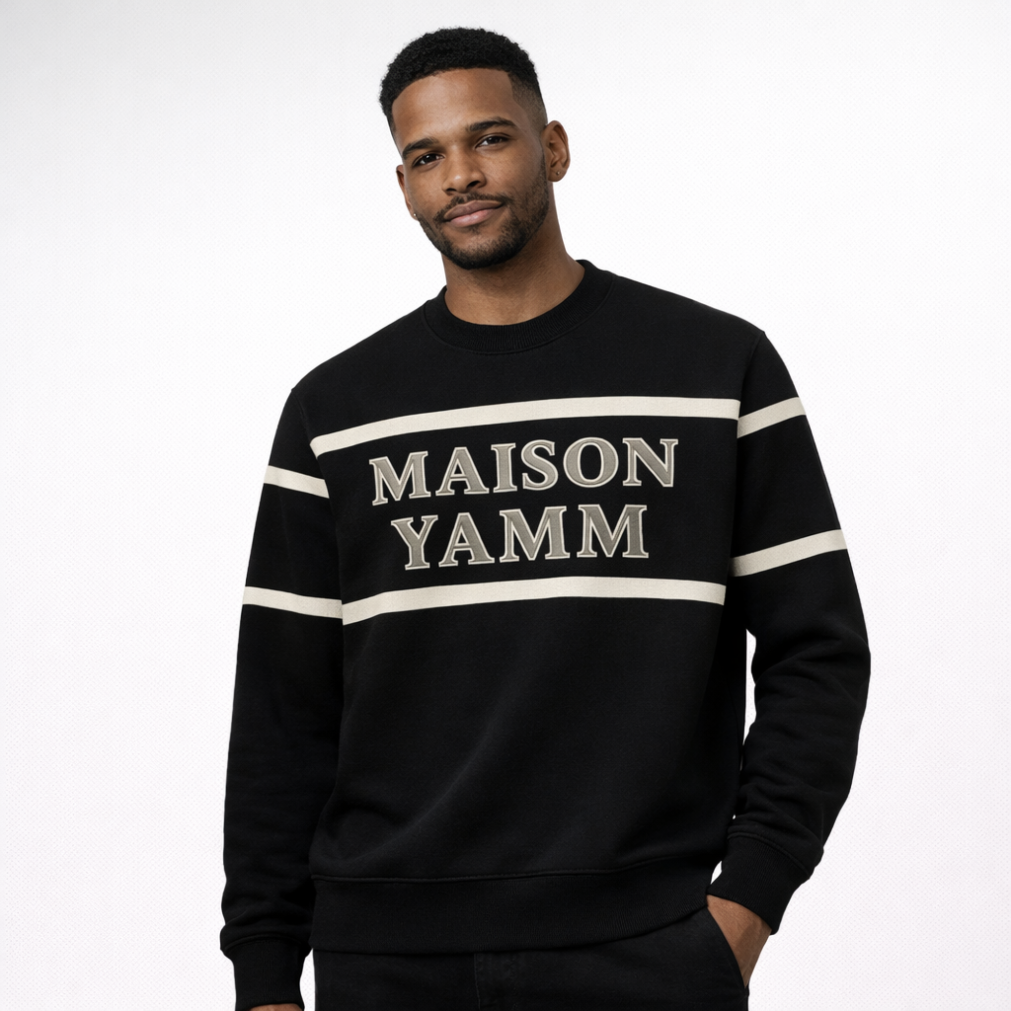 Le pull noir Maison YAMM House Edition rend hommage à l’identité forte de la Maison. Sa base noire est sublimée par des bandes blanches contrastantes et un logo « MAISON YAMM » brodé en grand sur la poitrine. Plus qu’un simple vêtement, c’est un manifeste de style, une signature visible et élégante.
