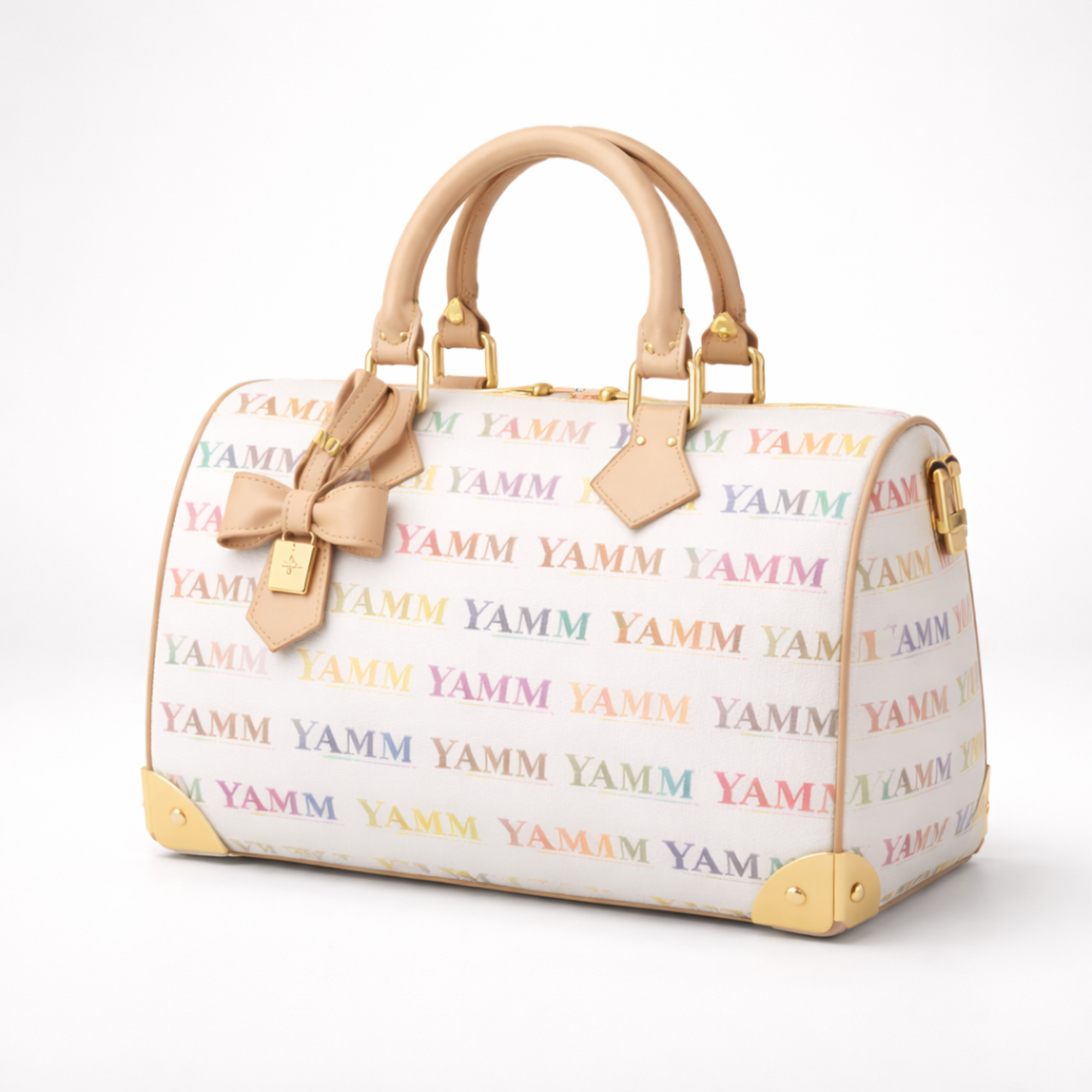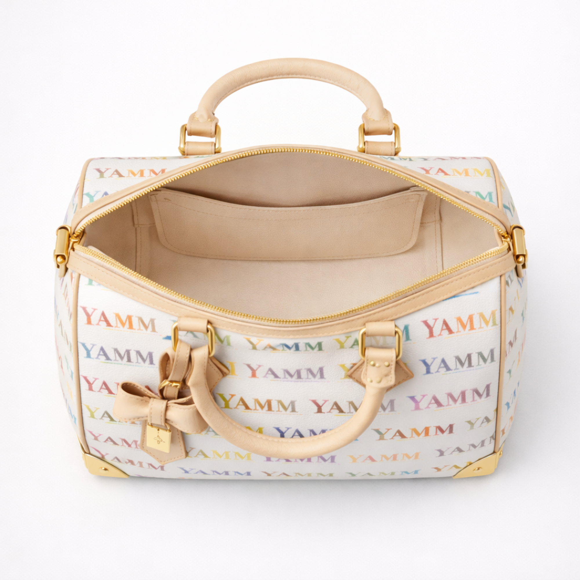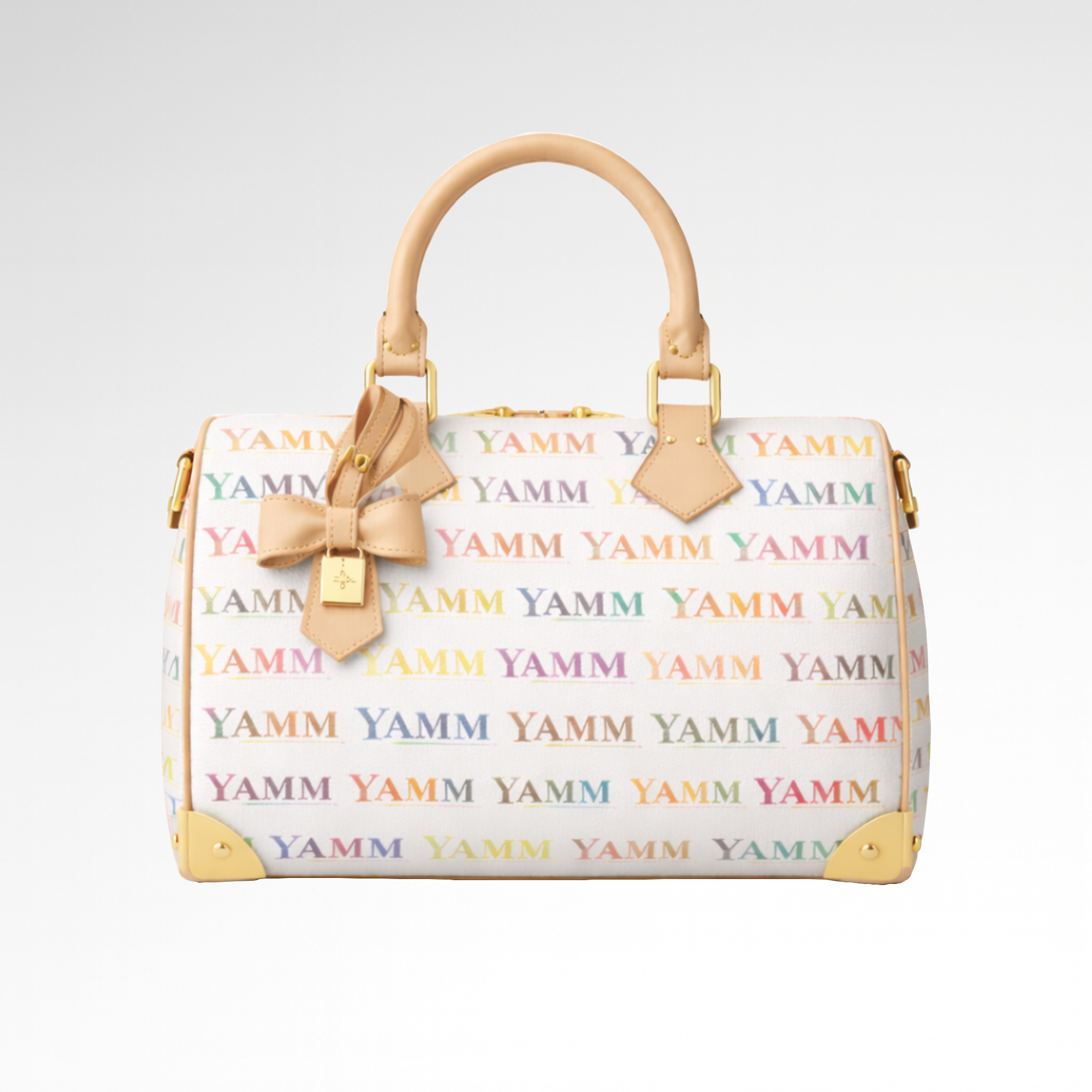 Le Sac Boston YAMM Monogram Multicolore incarne une vision lumineuse et élégante du luxe contemporain. Sa toile signature parsemée du monogramme YAMM en teintes délicates, associée à des finitions en cuir clair, offre une allure raffinée, féminine et résolument couture.