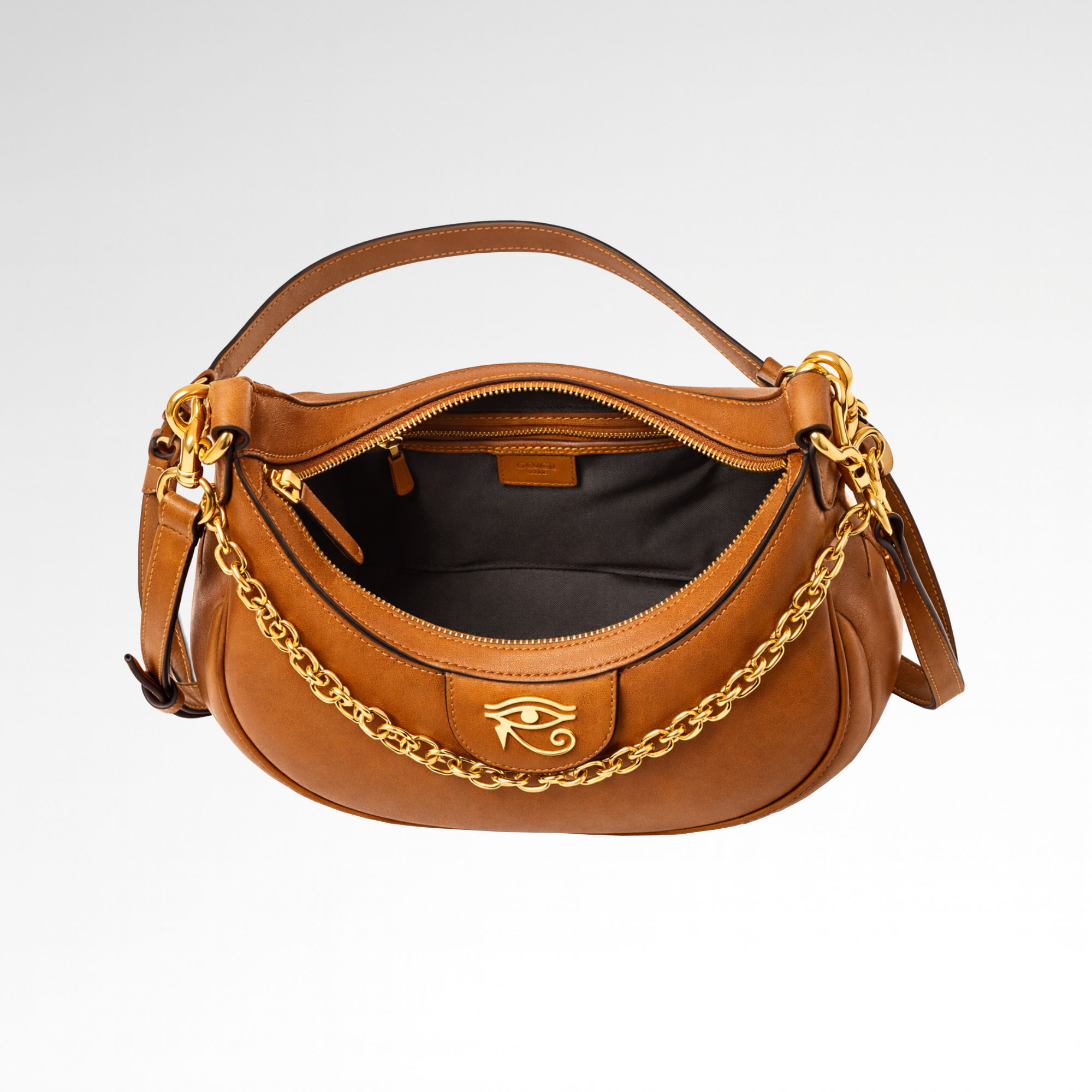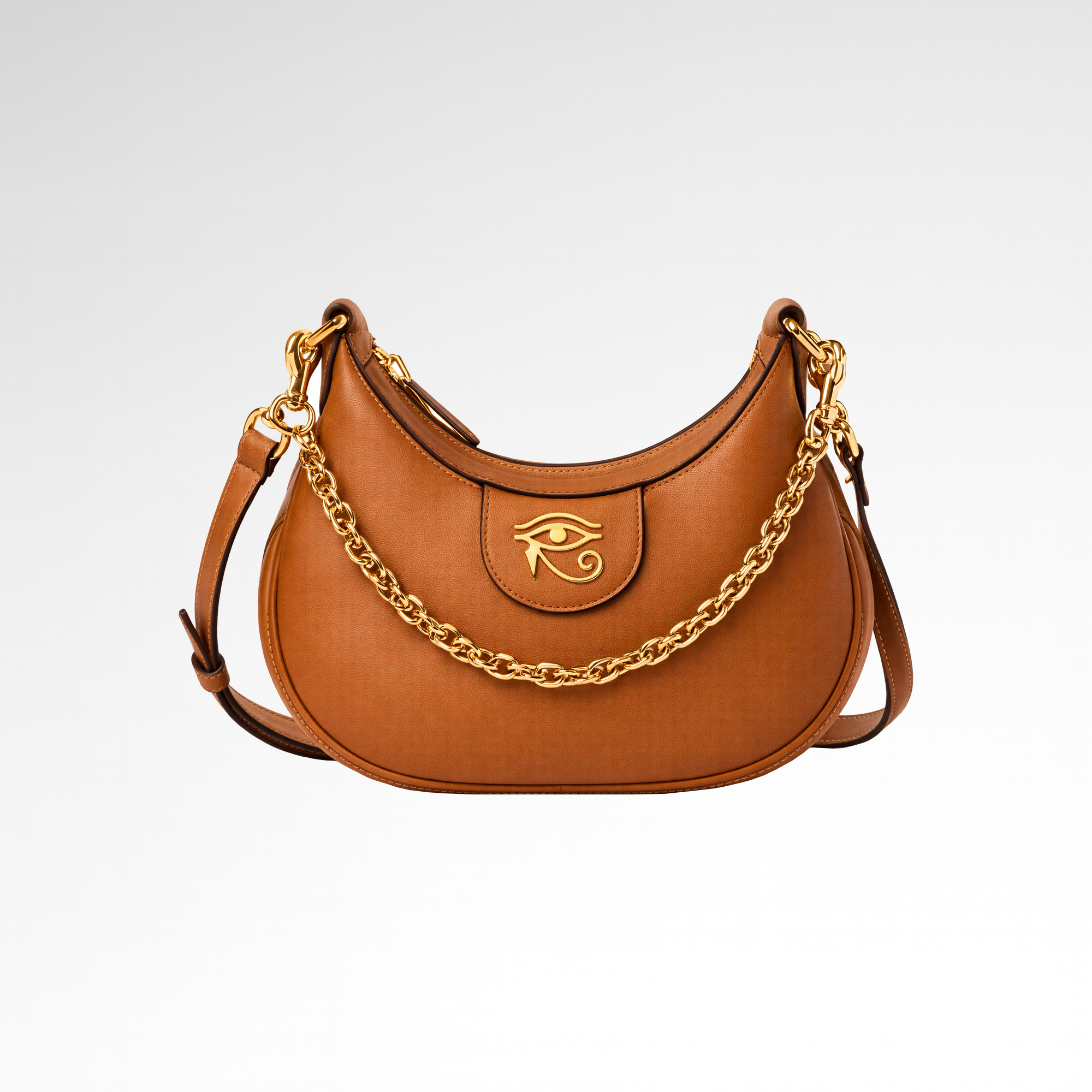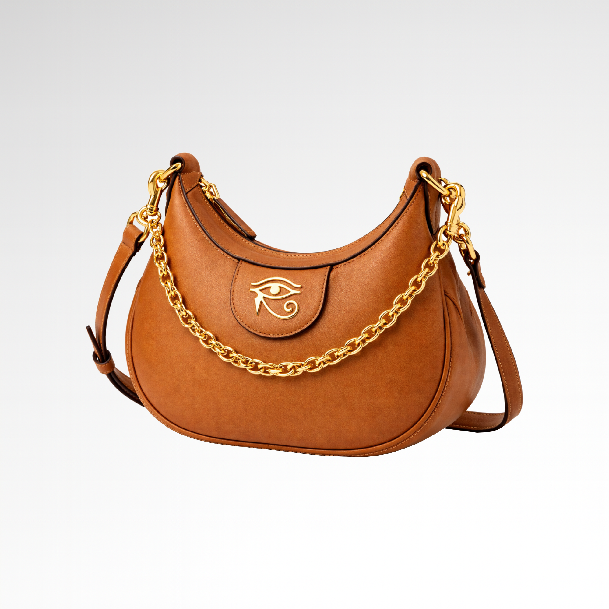 Le sac demi-lune YAMM en cuir cognac séduit par sa forme iconique, sa chaîne dorée élégante et son Œil signature. Une création luxueuse, intemporelle et parfaitement équilibrée.