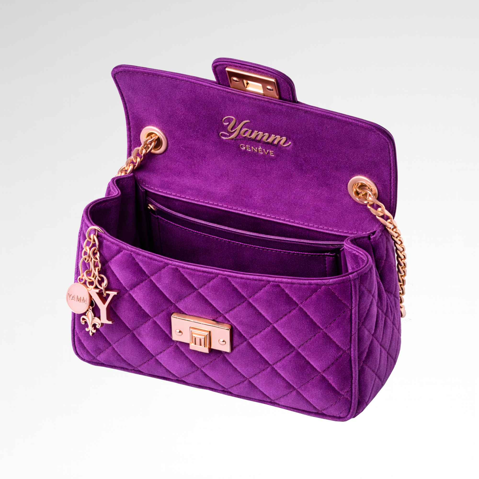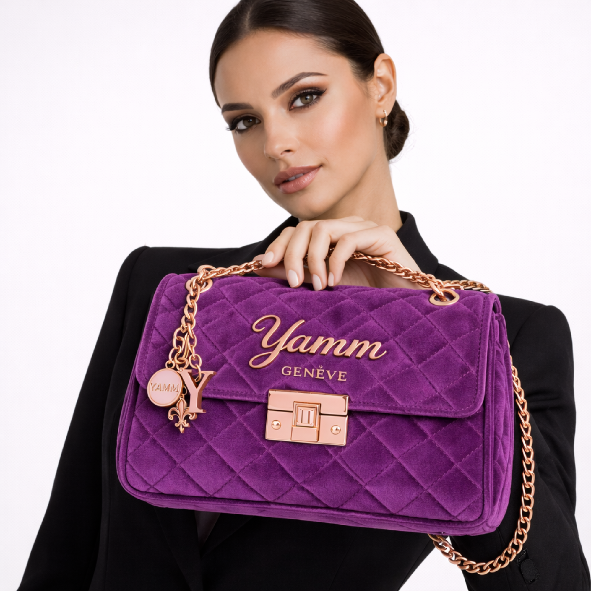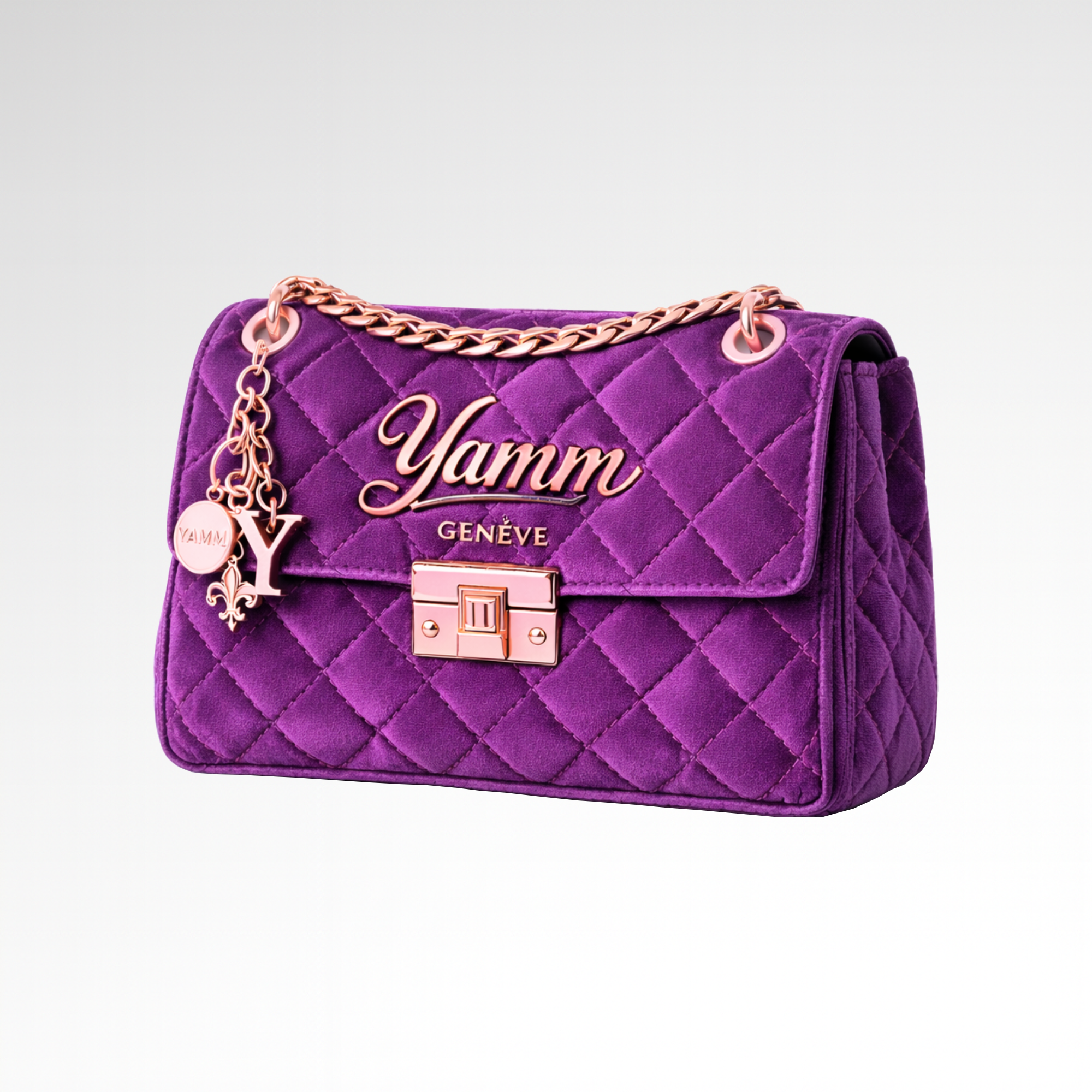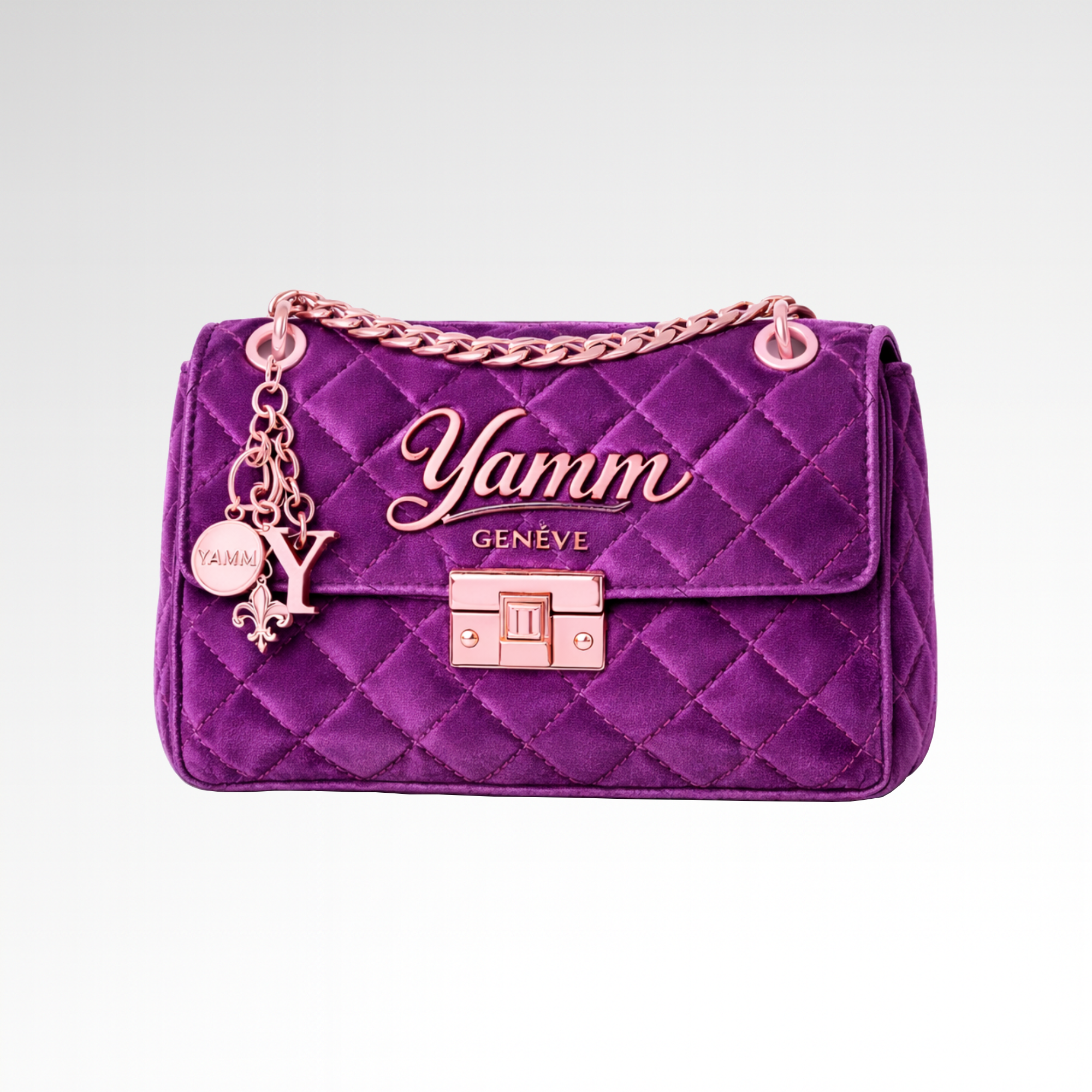 La silhouette iconique est sublimée par le logo YAMM Genève en finition rose pastel, harmonieusement assorti à la chaîne métallique et au fermoir. Ce contraste délicat entre le violet intense et le rose poudré confère au sac une allure féminine, moderne et sophistiquée.