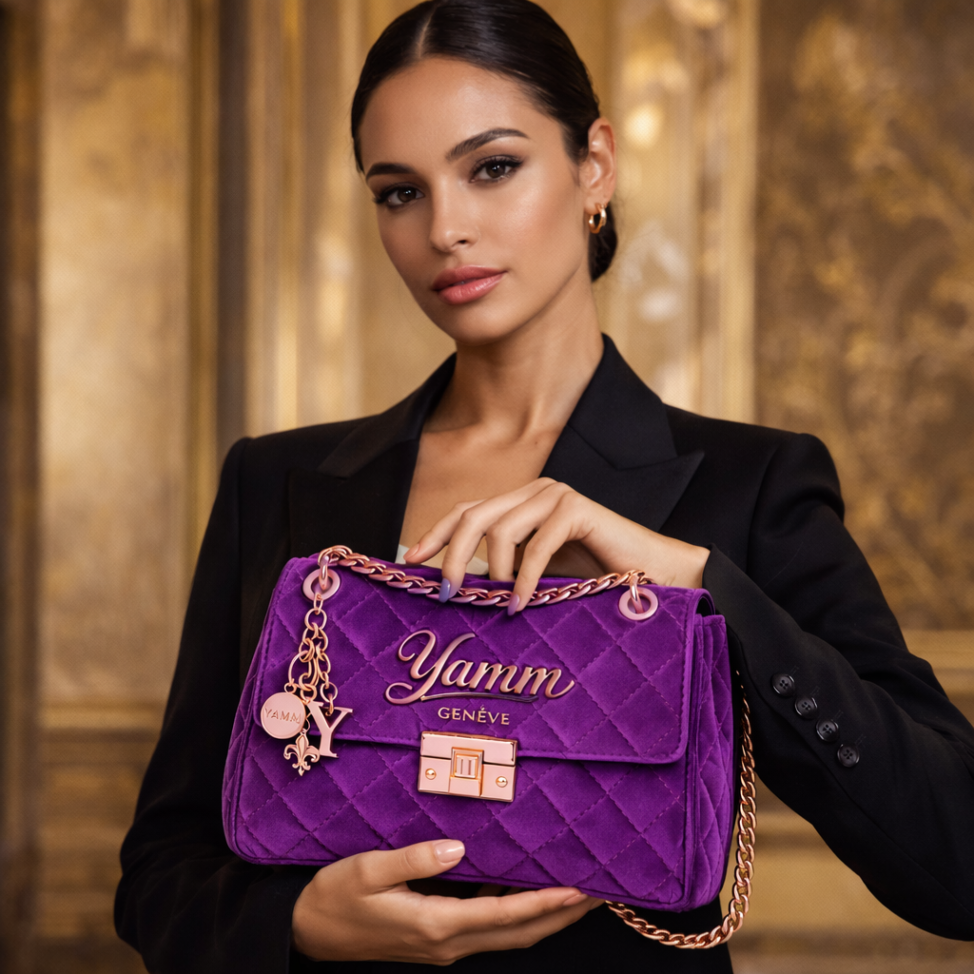 Le Sac YAMM Genève Matelassé Violet Velours incarne une vision audacieuse et raffinée du luxe contemporain. Sa teinte violette profonde, associée à la douceur du velours et aux finitions rose pastel, en fait une pièce couture au caractère rare et élégant.