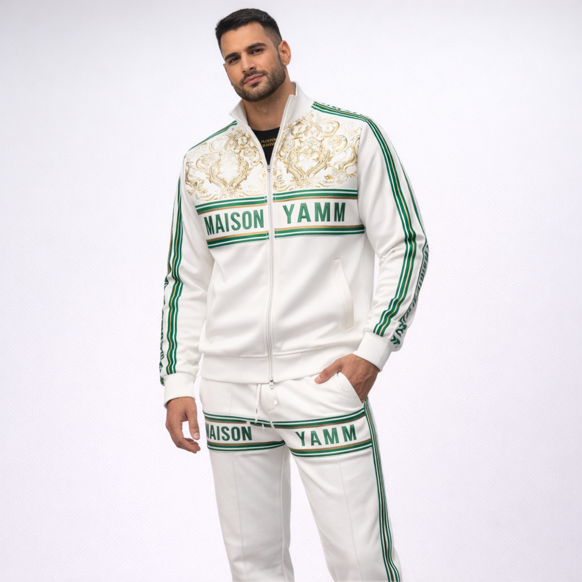 Le survêtement blanc baroque Green Star se distingue par son esthétique moderne et majestueuse. Réalisé en polyester premium 400 gsm à la finition satinée, il conjugue résistance et éclat luxueux. Sa base immaculée est magnifiée par des ornements dorés et des bandes vertes éclatantes, signature de puissance et d’élégance. Chaque détail incarne le savoir-faire couture de la Maison YAMM.