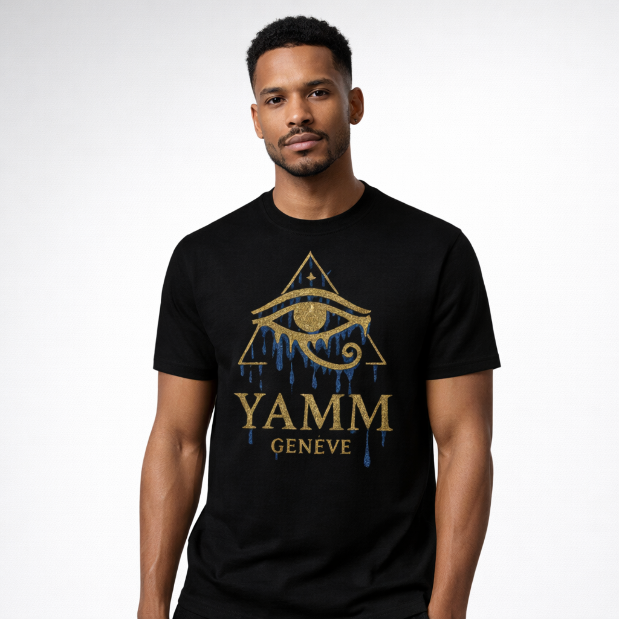 Le T-shirt The Golden Gaze de YAMM Genève est une pièce iconique, symbole mystique sublimé par l’éclat des strass. Audacieux, luxueux, intemporel.