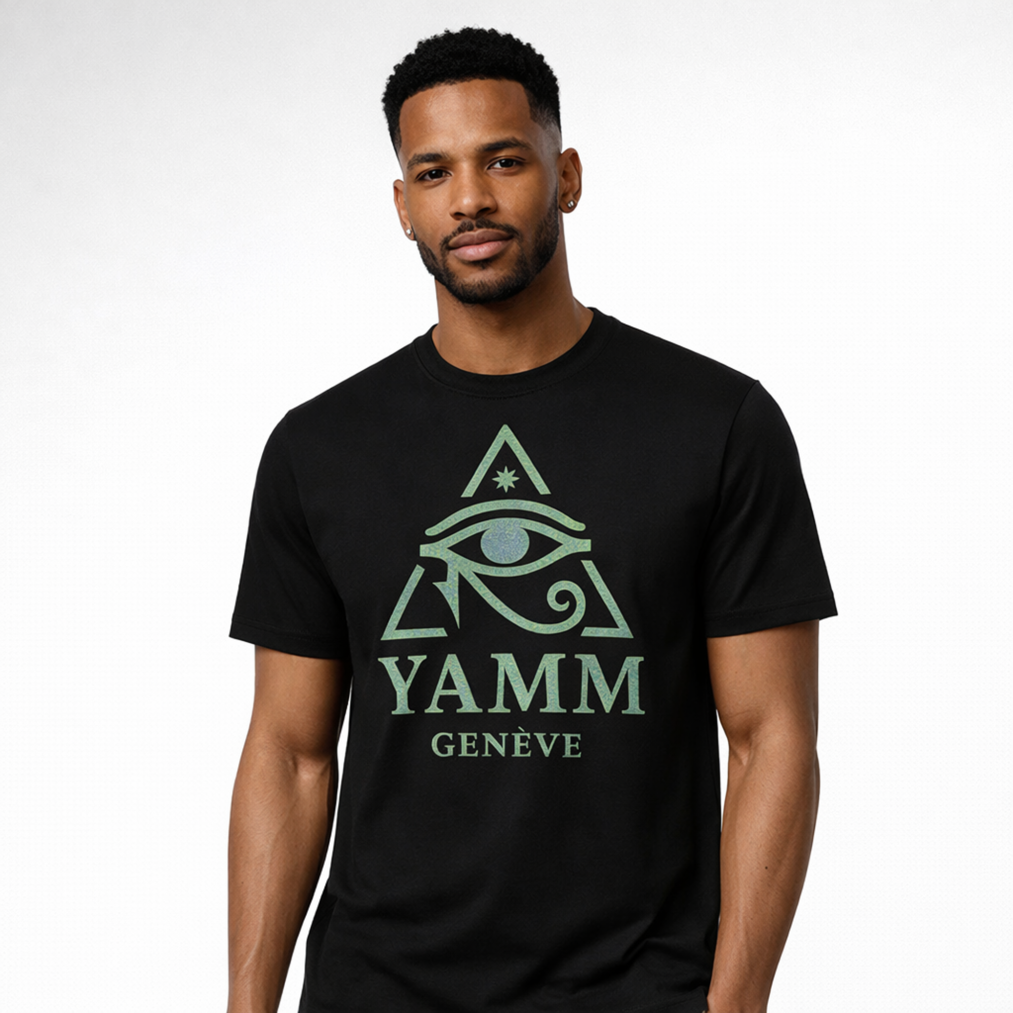 Le T-shirt Holo réinvente le symbole emblématique de la Maison YAMM avec une touche d’illusion et de lumière. Sur fond noir profond, le logo sacré – l’œil au sein du triangle – se pare d’un effet holographique iridescent qui change subtilement de teinte selon la lumière, incarnant le mystère et la dualité du visible et de l’invisible.