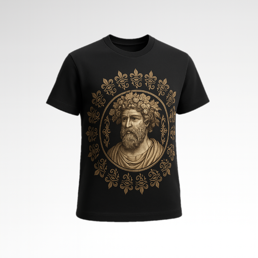 Le Tee-shirt Bacchusa revisite la mythologie à travers un design doré magistral. Imprimé sur un coton premium noir, il associe puissance antique et raffinement contemporain.