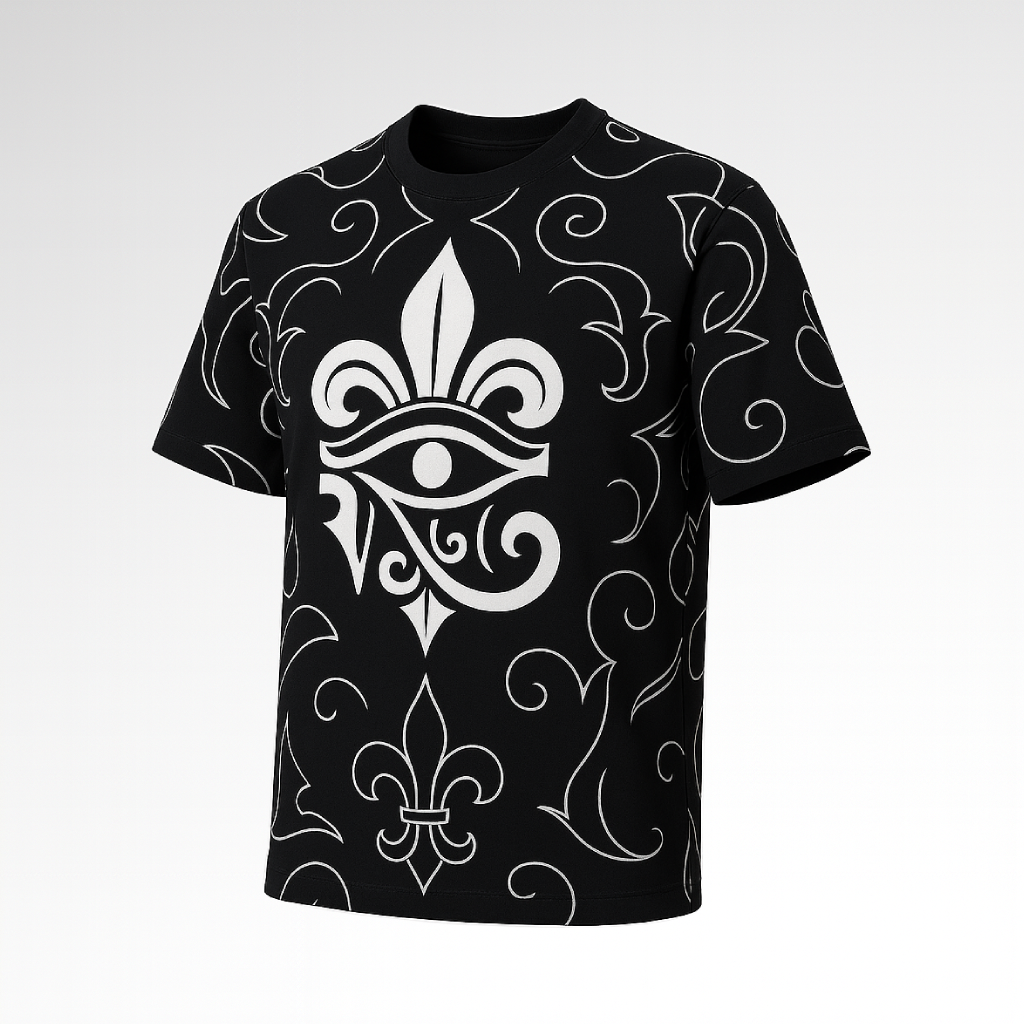Le Tee-shirt Gamma incarne l’union entre mysticisme et élégance contemporaine. Son motif central, l’Œil Sacré orné d’une fleur de lys, symbolise la vigilance, la connaissance et le pouvoir selon la Maison YAMM.