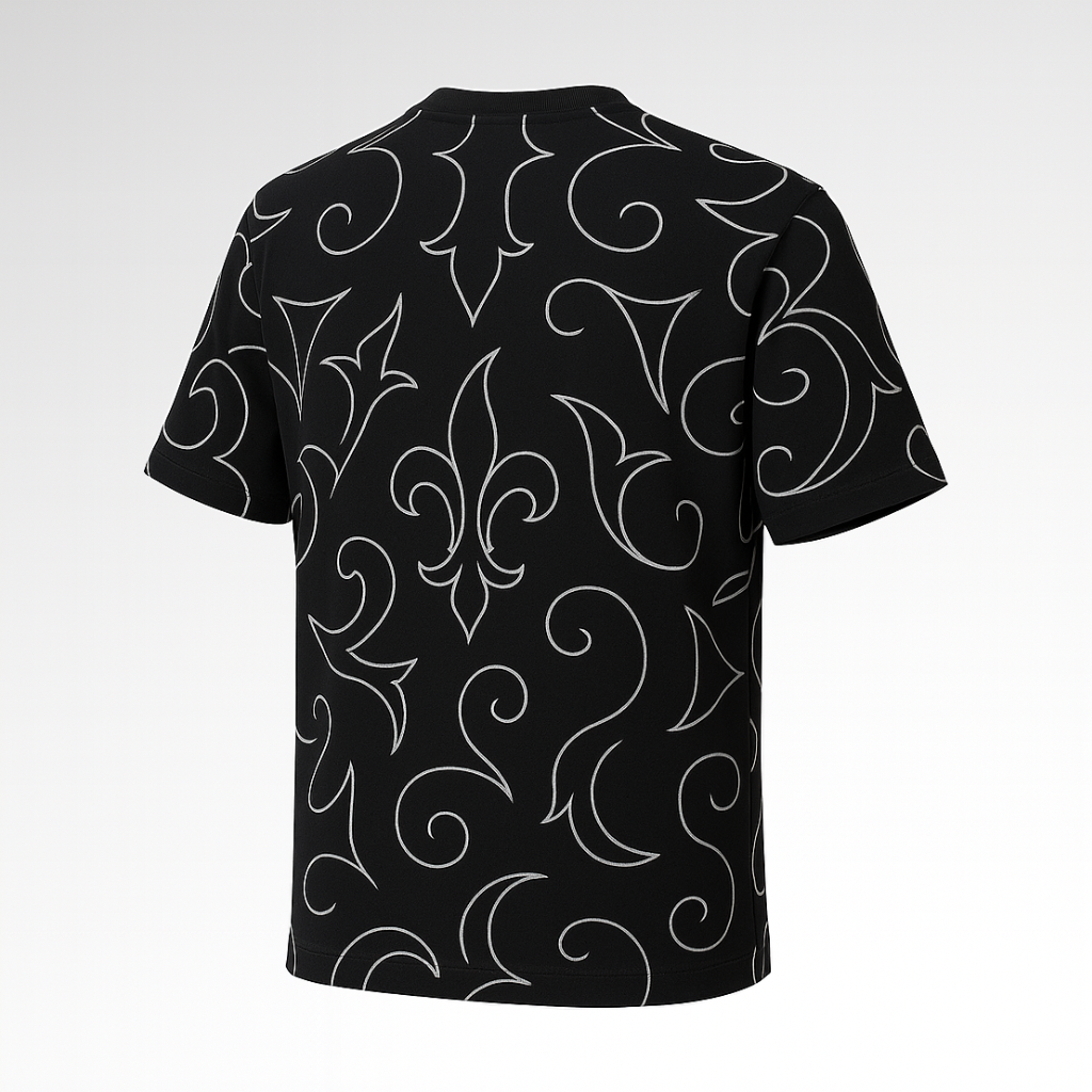 Orné de volutes et de symboles mystiques, le Tee-shirt Gamma se distingue par son motif intégral contrasté en blanc sur fond noir profond. Chaque détail graphique incarne la dualité entre ombre et lumière, dans un équilibre parfait.