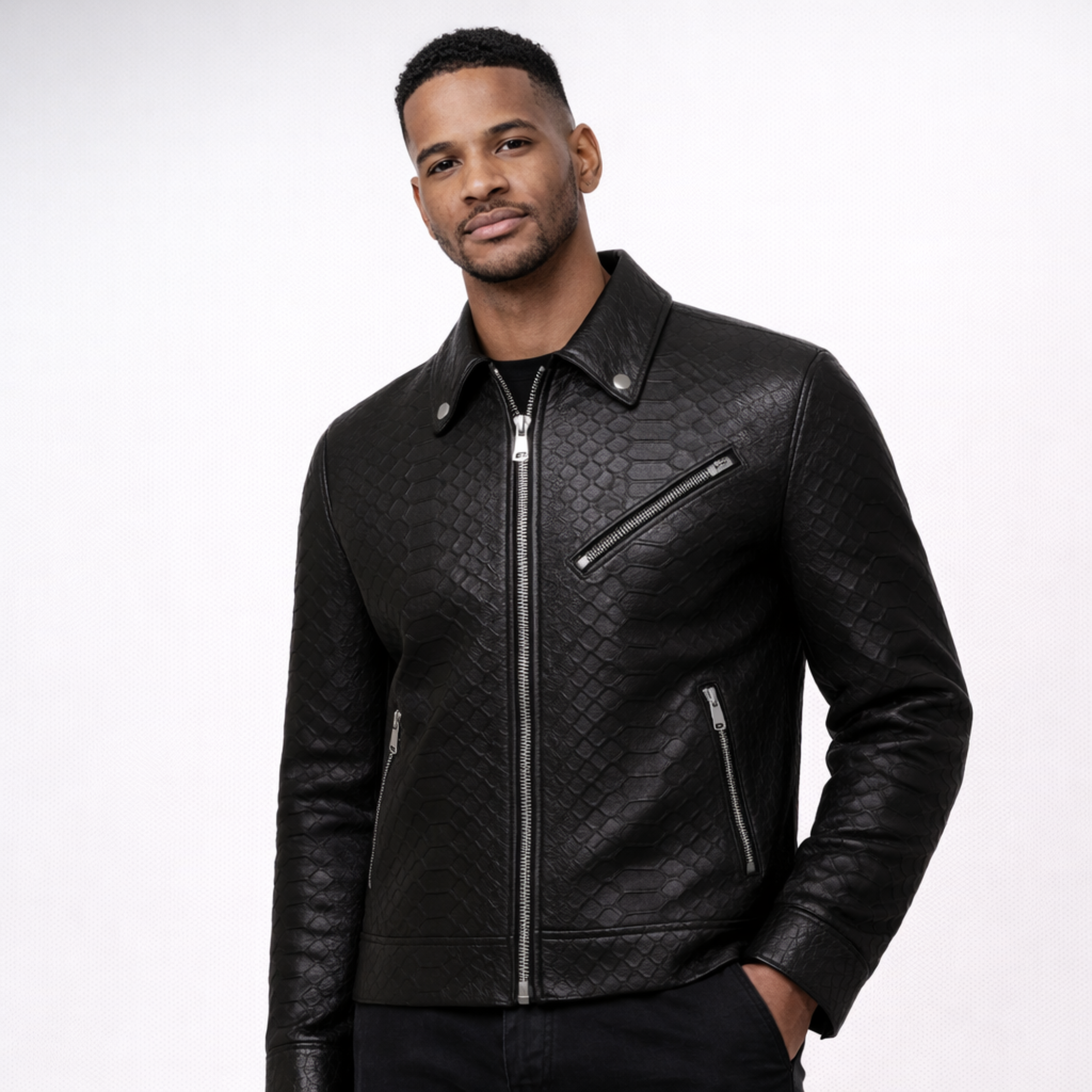Pensée pour sublimer la prestance masculine, la Veste Black Reptile se porte aussi bien sur une chemise élégante que sur un t-shirt noir. Sa coupe ajustée épouse parfaitement la silhouette, tandis que sa doublure intérieure assure chaleur et confort en toute saison.
