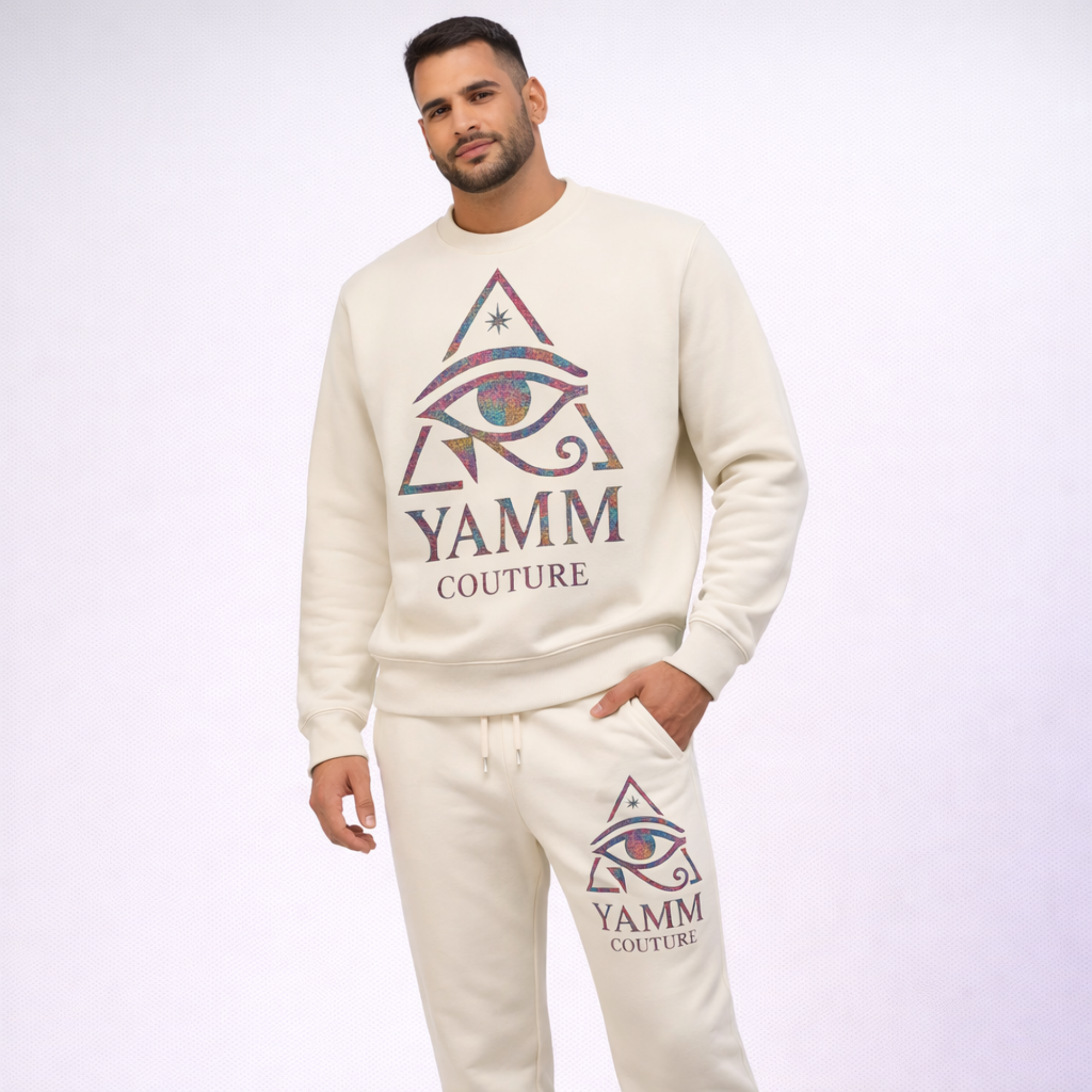 Le sweat ample met en valeur le logo YAMM Couture en finition holographique, tandis que le pantalon jogging resserré à la cheville reprend les mêmes détails lumineux. Les cordons renforcés, coutures précises et impressions haute qualité illustrent l’exigence propre au vestiaire YAMM. Chaque reflet holographique transforme cet ensemble en véritable œuvre de mode contemporaine.